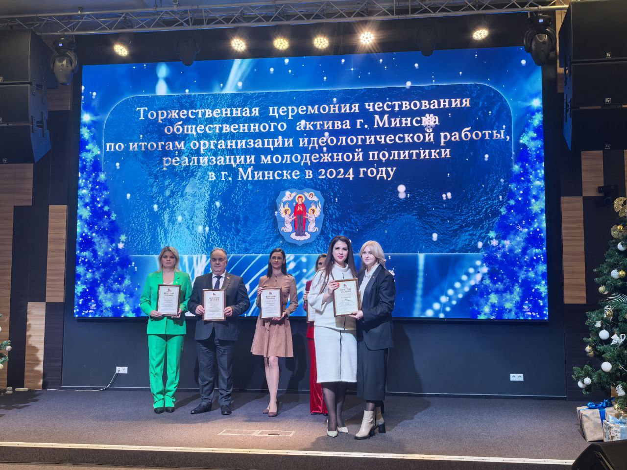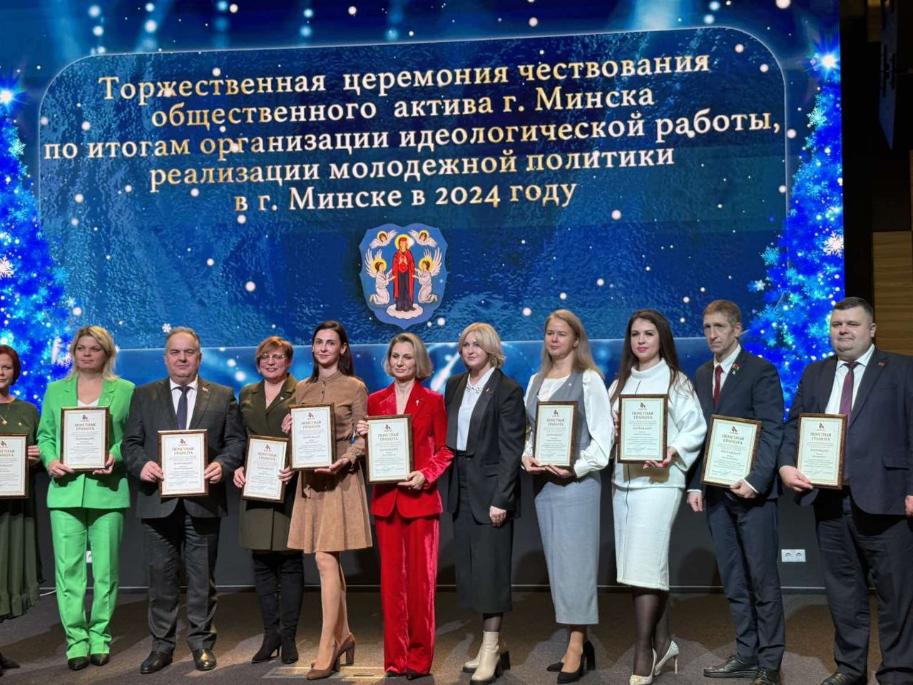 Почетные грамоты МГО РОО «Белая Русь» на торжественной церемонии чествования общественного актива г.Минска по итогам организации идеологической работы, реализации молодежной политики в г.Минске в 2024 году вручила активистам председатель Минской городской «Белой Руси», депутат Мингорсовета Наталья Воронова.