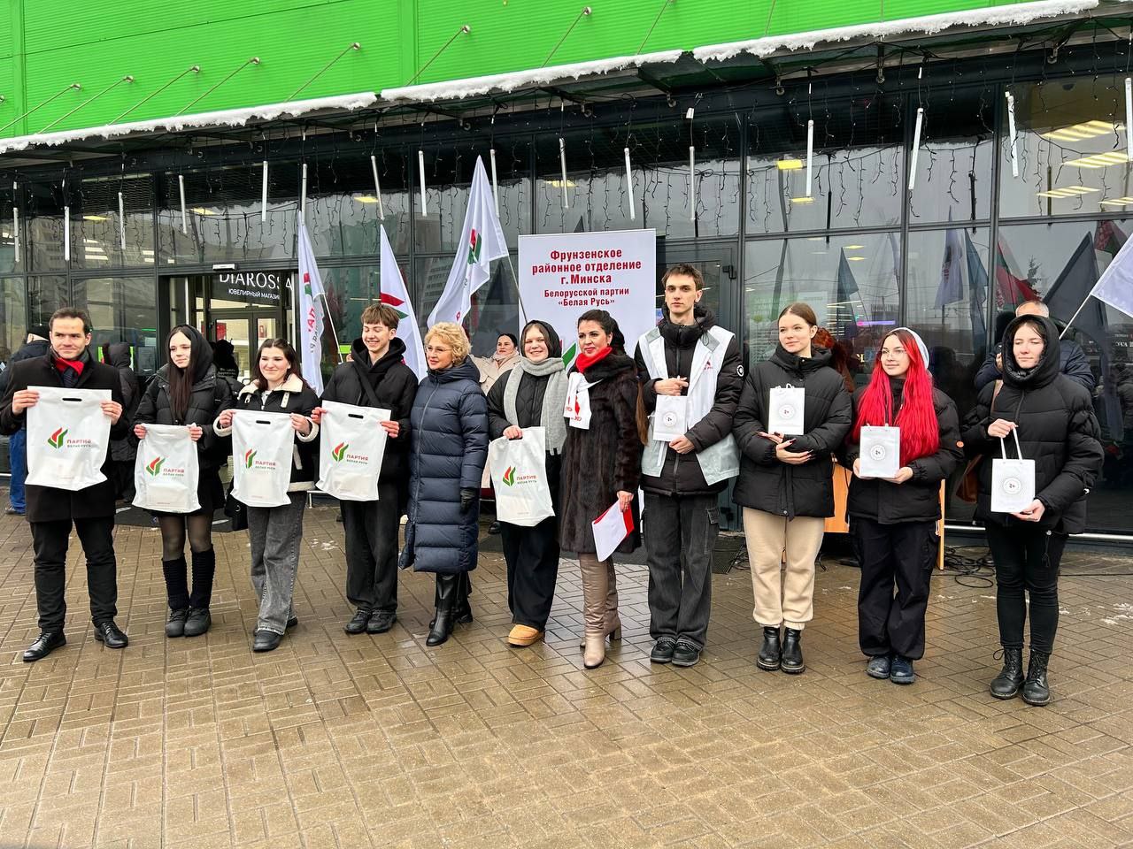 Культурно-патриотическая акция «Я буду голосовать!», организованная Фрунзенской районной организацией «Белая Русь» и Белорусской партией «Белая Русь», собрала людей разных возрастов, разных взглядов, разных профессий на площадке перед ТЦ «АЛМИ».