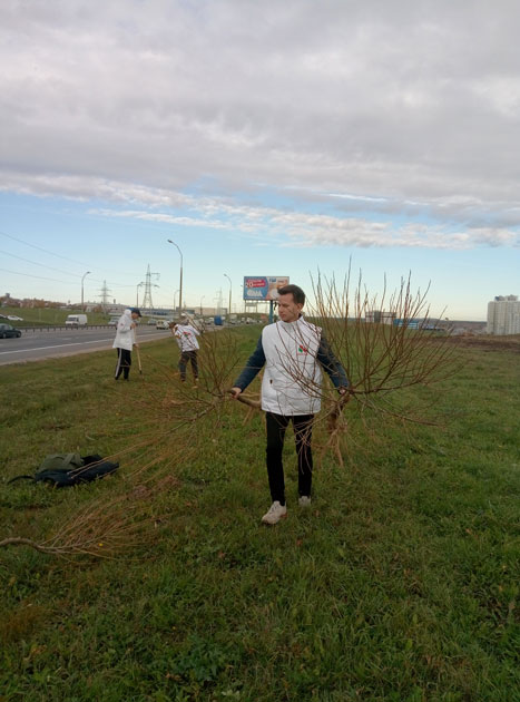 Трудовой десант высадился вдоль кольцевой дороги и с энтузиазмом и ответственностью включился в работу. В результате посажено 25 молодых деревьев шаровидной ивы.