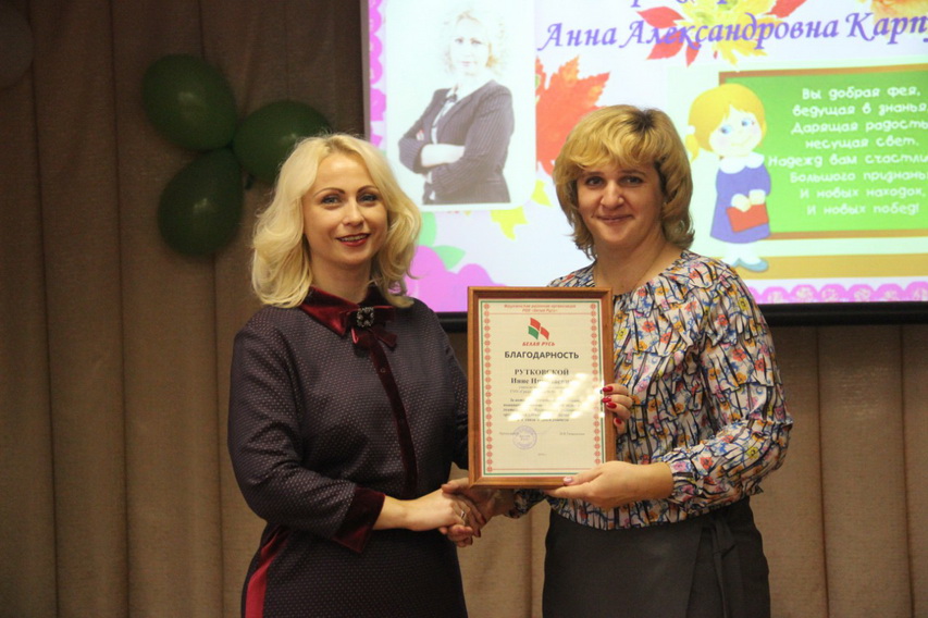 Председатели первичек от имени всей Фрунзенской «Белой Руси» и от всего сердца поблагодарили педагогов за их нелегкий, но благородный труд, за их активное участие в общественной жизни района. Вместе с добрыми пожеланиями им вручили Грамоты и Благодарственные письма Минской городской и Фрунзенской районной организаций РОО «Белая Русь».
