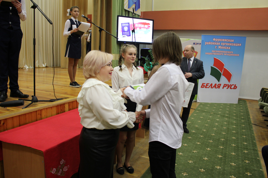 В торжественной церемонии вручения паспортов приняли участие: Шкруднев Сергей Анатольевич – глава администрации Фрунзенского района г.Минска, Панасюк Василий Васильевич – депутат Палаты представителей Национального собрания Республики Беларусь, Лукашевич Надежда Владимировна – депутат Минского городского Совета депутатов, Тимашишин Игорь Валентинович – председатель Фрунзенской районной организации г.Минска РОО «Белая Русь», Скачкова Александра - Первый секретарь Фрунзенского РК ОО «БРСМ».