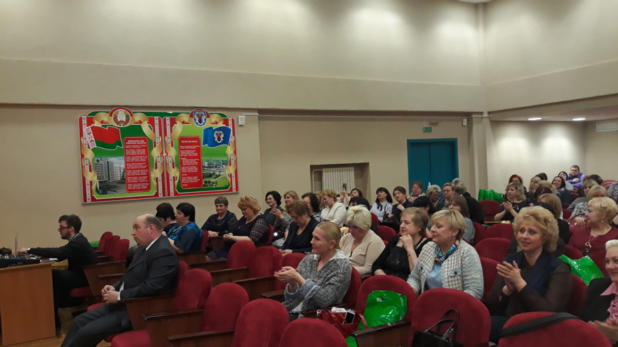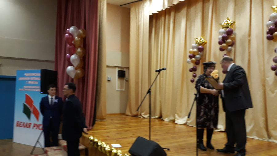 В этот день в зале было море цветов и улыбок. Музыкальный подарок от «Белой Руси» преподнес артист белорусской эстрады, член Фрунзенской организации РОО «Белая Русь» Георгий Волчек. Зал то и дело взрывался от аплодисментов.